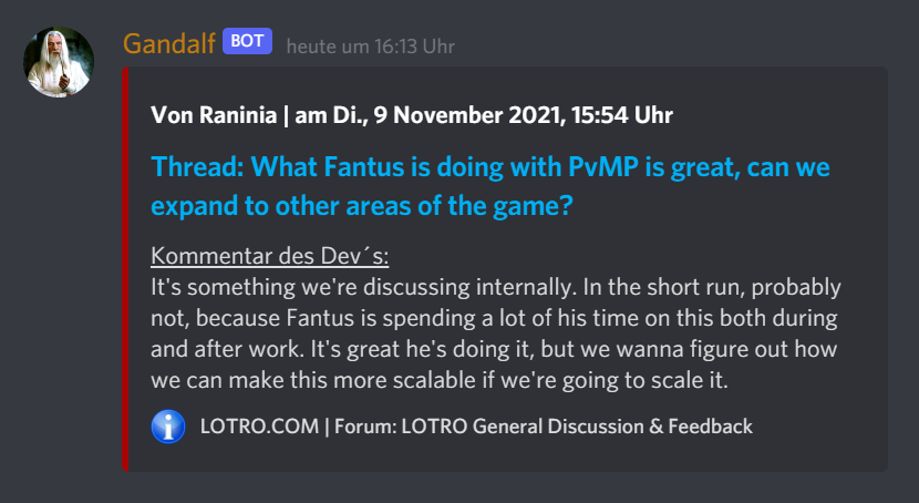 Somit behaltet ihr einen Überblick der SSG Mitarbeiter, wenn diese etwas im offiziellen Forum (LOTRO.COM) kommentieren, so wird es euch mein Informations-Bot Gandalf im Dev Tracker Channel wissen lassen.