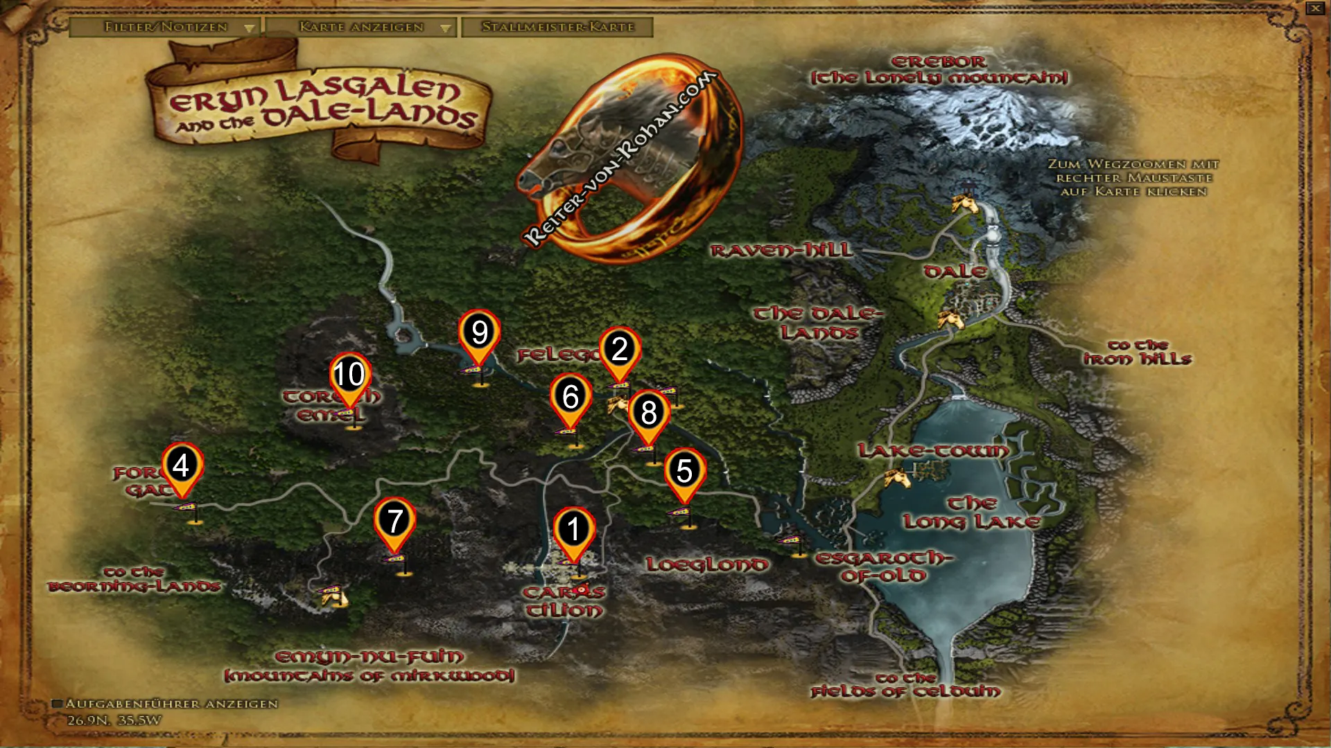 In ganz Eryn Lasgalen müsst ihr insgesamt 10 Orte entdecken, um diese Tat abzuschließen. Einige werdet ihr vermutlich durch das Questen so oder so finden, aber falls euch ein Ort fehlen sollte, so schaut euch unten die Übersichtskarte an. Auf dieser Karte habe ich euch alle Orte markiert, wo ihr hin müsst.