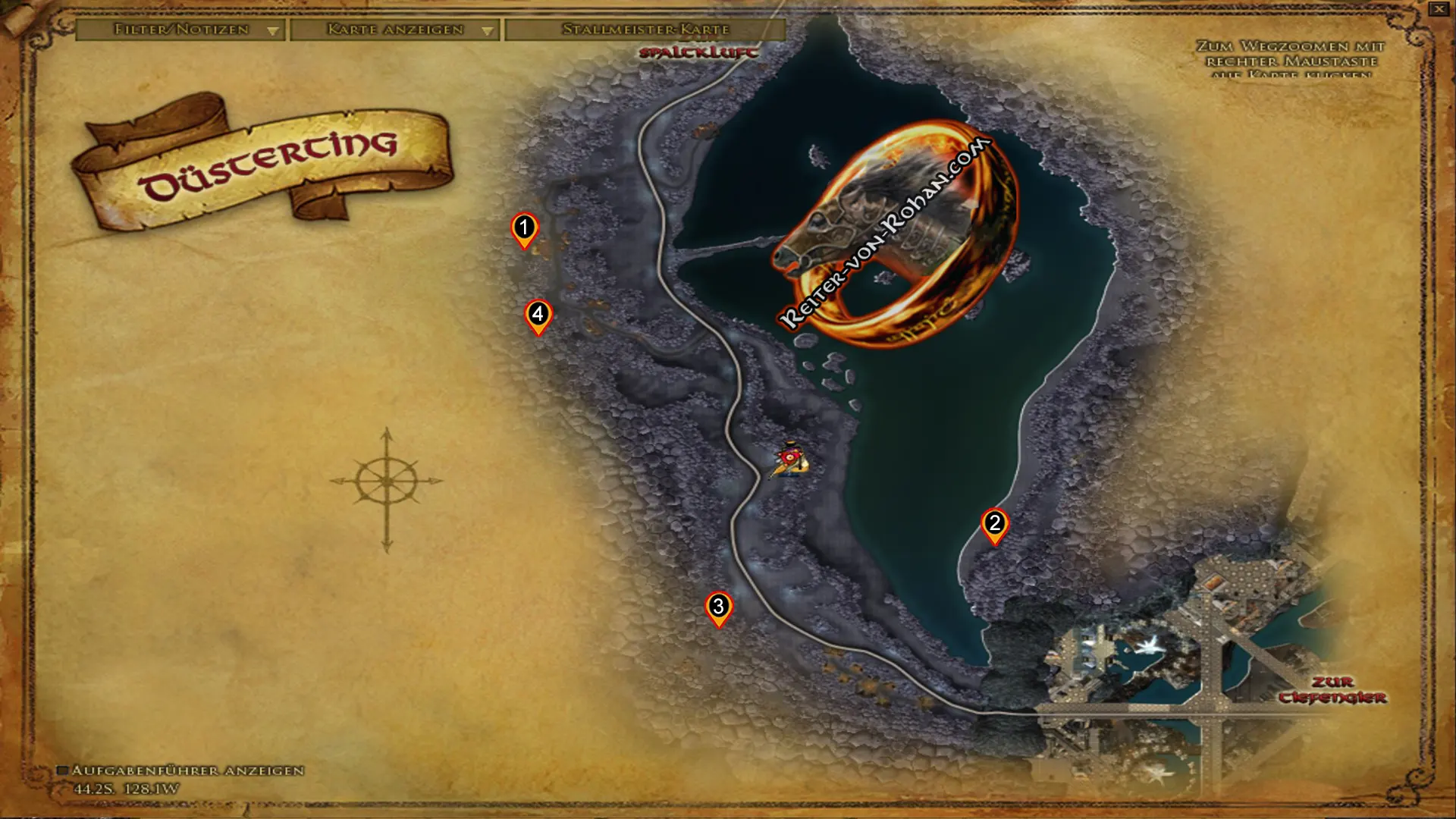Die Markierungen auf der Karte zeigen den ungefähren Bereich des Fundortes an und müssen daher nicht immer zu 100 % richtig sein! Zudem kann es untrer Umständen sein, dass du dir das Gebiet / Questpack im HdRO Shop kaufen musst, um die Taten zu erhalten / vervollständigen.Damit du die von mir oben genannten Koordinaten leichter zu finden kannst, empfehle ich dir Folgendes Plugin - Way Point