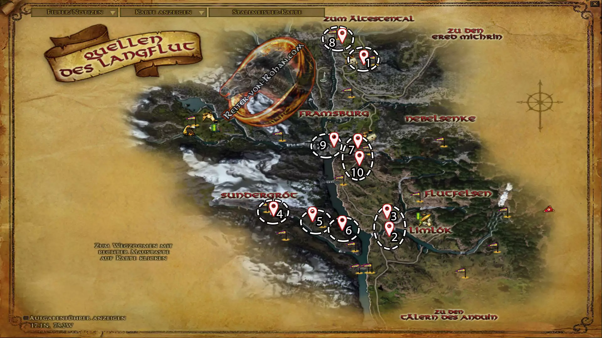 In der Region Quellen des Langflut in der Herr der Ringe Online, müsst ihr erneut Zwergem-Markierungen finden, insgesamt 10. Unten findest du dazu eine Übersichtskarte und die dazugehörenden Koordinaten. Schaue dir die Karte an und suche dann diese Orte auf.