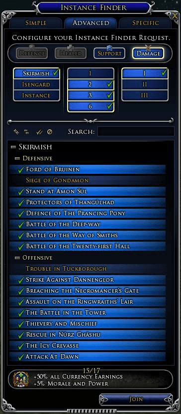 Die neue Registerkarte „Fortgeschritten“ ist der Ort, an dem ihr genauestens festlegen könnt, nach welchen Instanzen gesucht werden soll. Im oberen Screenshot will dieser Spieler jedes Scharmützel außer „Belagerung von Gondamon“ und „Ärger in Buckelstadt“ spielen.
