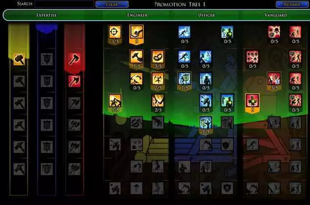 Wir sprechen von unserem Eigenschaftensystem für Beförderungen auch vom „Buffet“. Punkte werden in die Eigenschaften auf der rechten Seite des Fensters investiert, die lose in Spalten für jede Rolle zusammengestellt sind. Jede Eigenschaft hat fünf Ränge und mit jedem zusätzlichen Rang erhöhen sich zwar die Kosten, andererseits aber auch die Effektivität. Jede Eigenschaft benötigt eine bestimmte Anzahl an „Rängen“, in die zu investieren sind, um sie schließlich freizuschalten. Es ist gleich, in welcher Rolle Eigenschaften „gekauft“ wurden, die Freischaltfunktion orientiert sich nur an der Gesamtanzahl der Ränge, in die Ihr investiert habt.